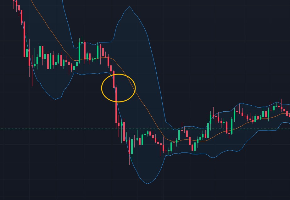 추세 추종 트레이딩 전략은 자산이 상승 추세에 있을 때 매수하고 하락 추세에 있을 때 매도하는 것입니다. 이 전략에서 트레이더는 볼린저 밴드를 사용하여 추세의 방향을 파악합니다. 자산 가격이 SMA 선 위에서 거래되면 상승 추세에 있는 것으로 간주됩니다. 자산 가격이 SMA 선과 교차하는 지점에서 상승으로 교차하는지, 하락으로 교차하는지에 따라 추세를 가늠하고 전략을 짜는 것입니다.
