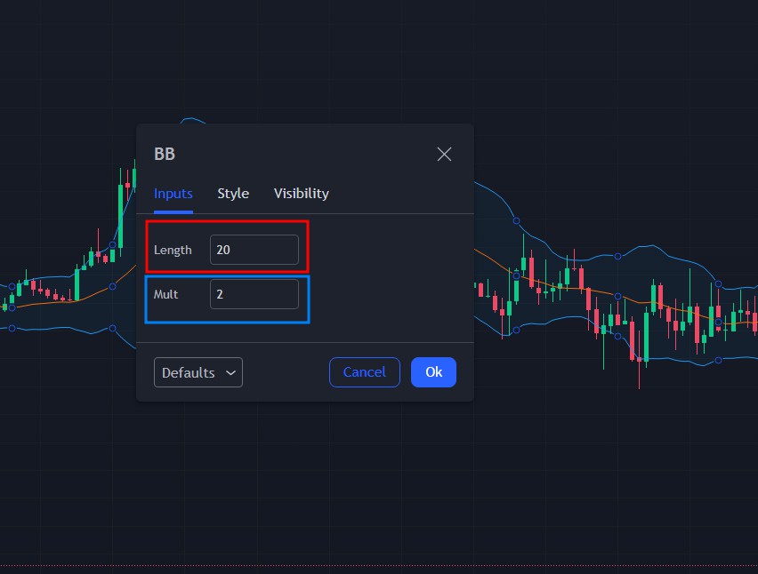 그래서 위 사진을 참고해 보시면 BB(볼린저 밴드), 20(기간 : 날짜수), 2(승수 : 표준편차)로 표시가 되어 있는 것을 확인 하실 수 있습니다. 톱니바퀴 모양을 누르시면 아래 사진과 같이 기간과 승수를 변경하실 수 있습니다.