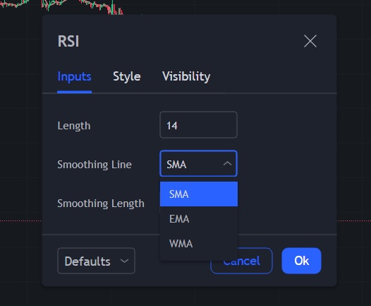 차트 뷰어에서 RSI를 추가하시면 아래와 같은 세팅창을 보실 수 있습니다. RSI의 공식이 어떻게 도출되는지 알아보고 오른쪽 사진에 보이는 SMA, EMA, WMA의 의미와 차트 주기 설정에 대해 한번 알아보겠습니다.