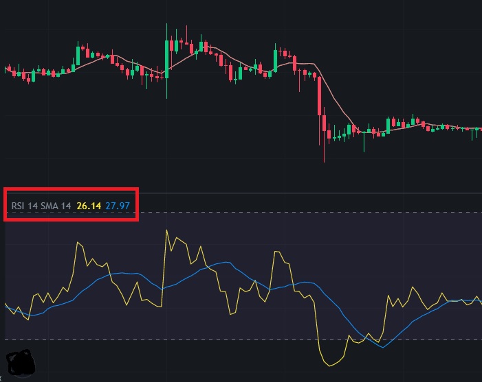 빨간색 네모 부분을 보시면 RSI 기간 14일 SMA 기간 14일로 설정 되어 있으며 노란색 선은 RSI그래프를 파란색 선은 SMA선을 나타냅니다. RSI만 표시해서 사용하는 경우도 많지만 사진과 같이 이동평균과 함께 표시해서 활용하는 경우도 많습니다.